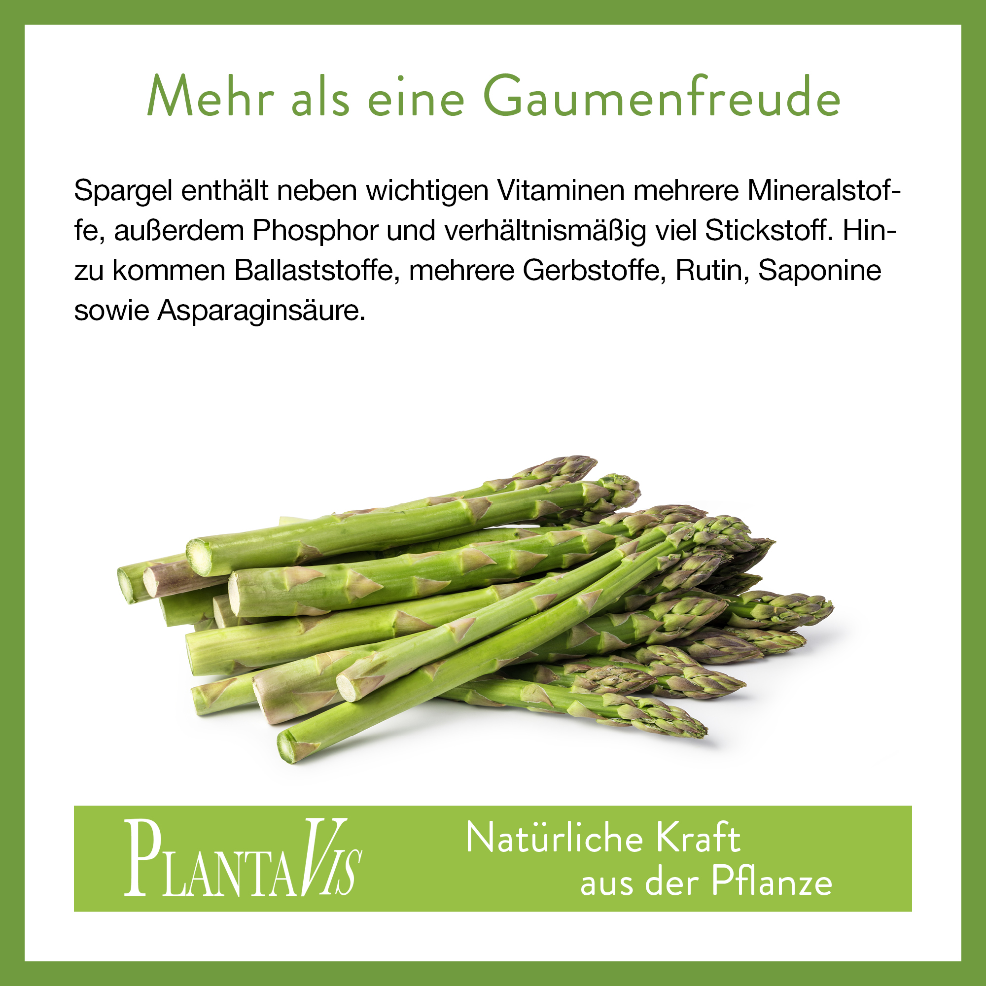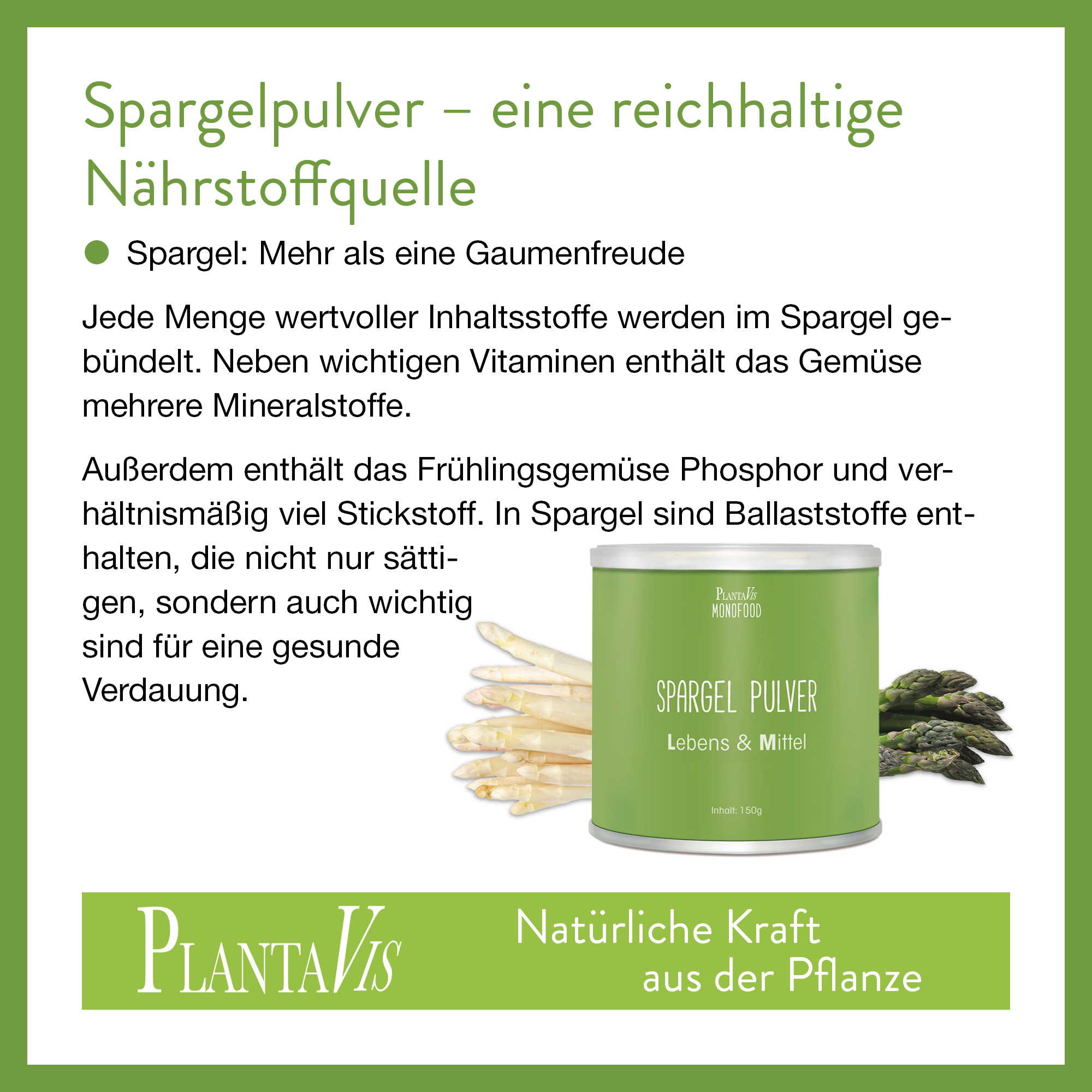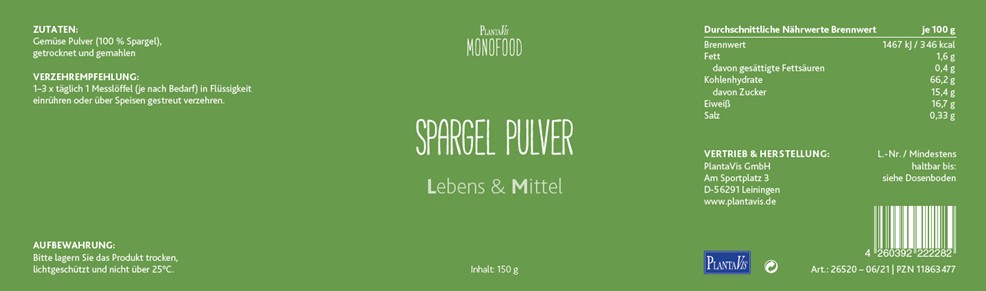 Schon vor über 5.000 Jahren wurde der Spargel verehrt. Sogar Hippokrates war ein großer Fan dieses Gemüses und der griechische Philosoph Platon rühmte den Geschmack von Spargel in seinen Werken. Da die Kultivierung recht aufwendig ist und Spargel von Hand geerntet wird, zählt das Gemüse eher zu den teureren Sorten. Spargel gilt deshalb seit jeher als besonders edel und wurde als „Königliches Gemüse“ bekannt. Heute macht Spargel nicht nur mit Sauce Hollandaise und Schinken eine gute Figur. PlantaVis gewinnt Spargelpulver zu 100 Prozent aus hochwertigem Spargel und bietet dem Körper so ganzjährig den Genuss von Spargel. Ohne Zusatzstoffe, ohne Gentechnik, laktose-, glutenfrei und vegan.