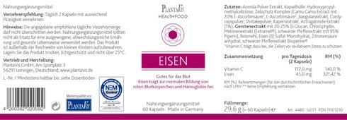 Die Tagesdosis von 2 Kapseln „Eisen – Gutes für das Blut“ deckt rund 320 Prozent der Eisen-Referenzmenge für den durchschnittlichen Erwachsenen (nach Lebensmittel-Informationsverordnung) und 140 Prozent der Referenzmenge an Vitamin C.