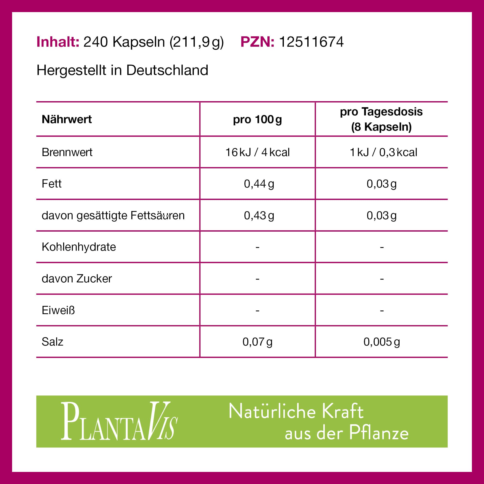 | Nährwert | pro 100g | pro Tagesdosis (8 Kapseln) | ||
