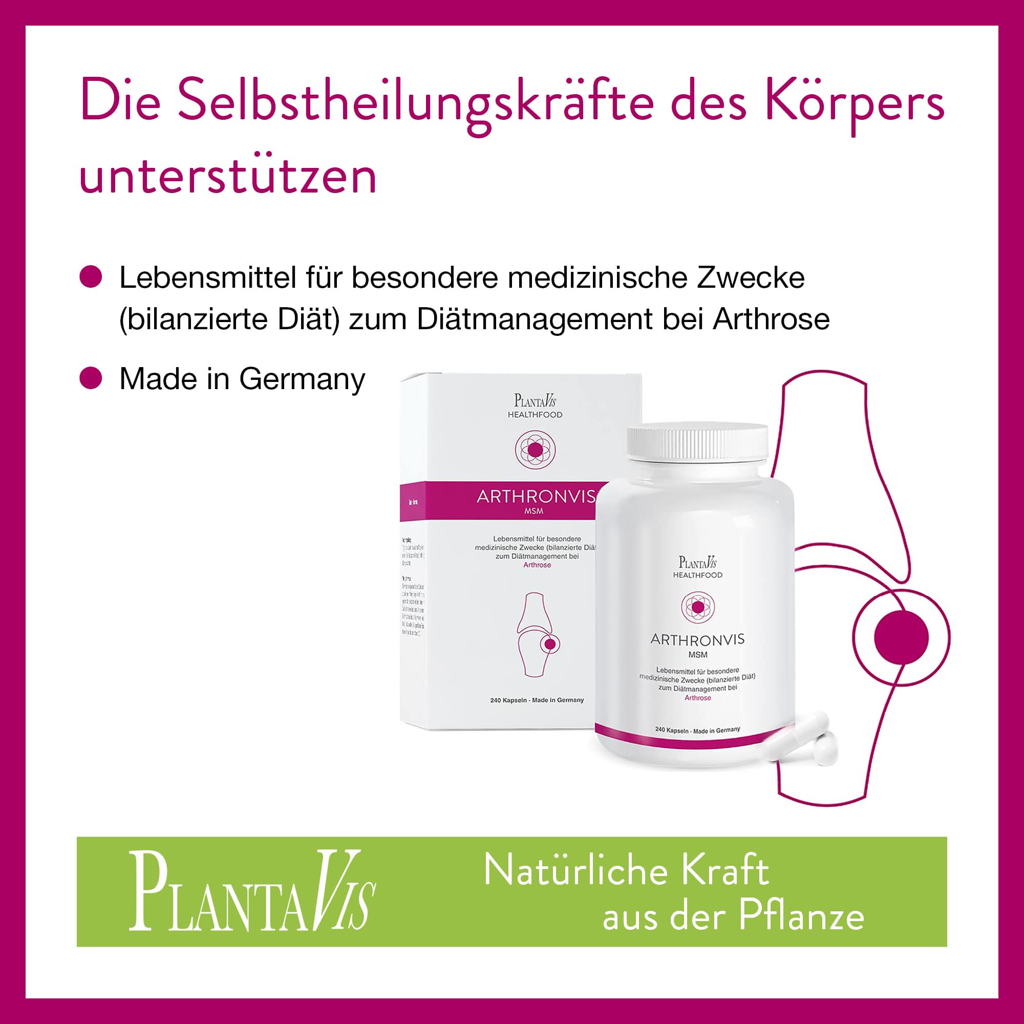In Deutschland leiden etwa fünf Millionen Frauen und Männer unter Beschwerden, die durch eine Arthrose verursacht werden. Die Tendenz ist sogar steigend. Arthronvis MSM ist ein Lebensmittel für besondere medizinische Zwecke (bilanzierte Diät) zum Diätmanagement bei Arthrose, das entzündungshemmend und schmerzlindernd auf die Gelenke wirkt.