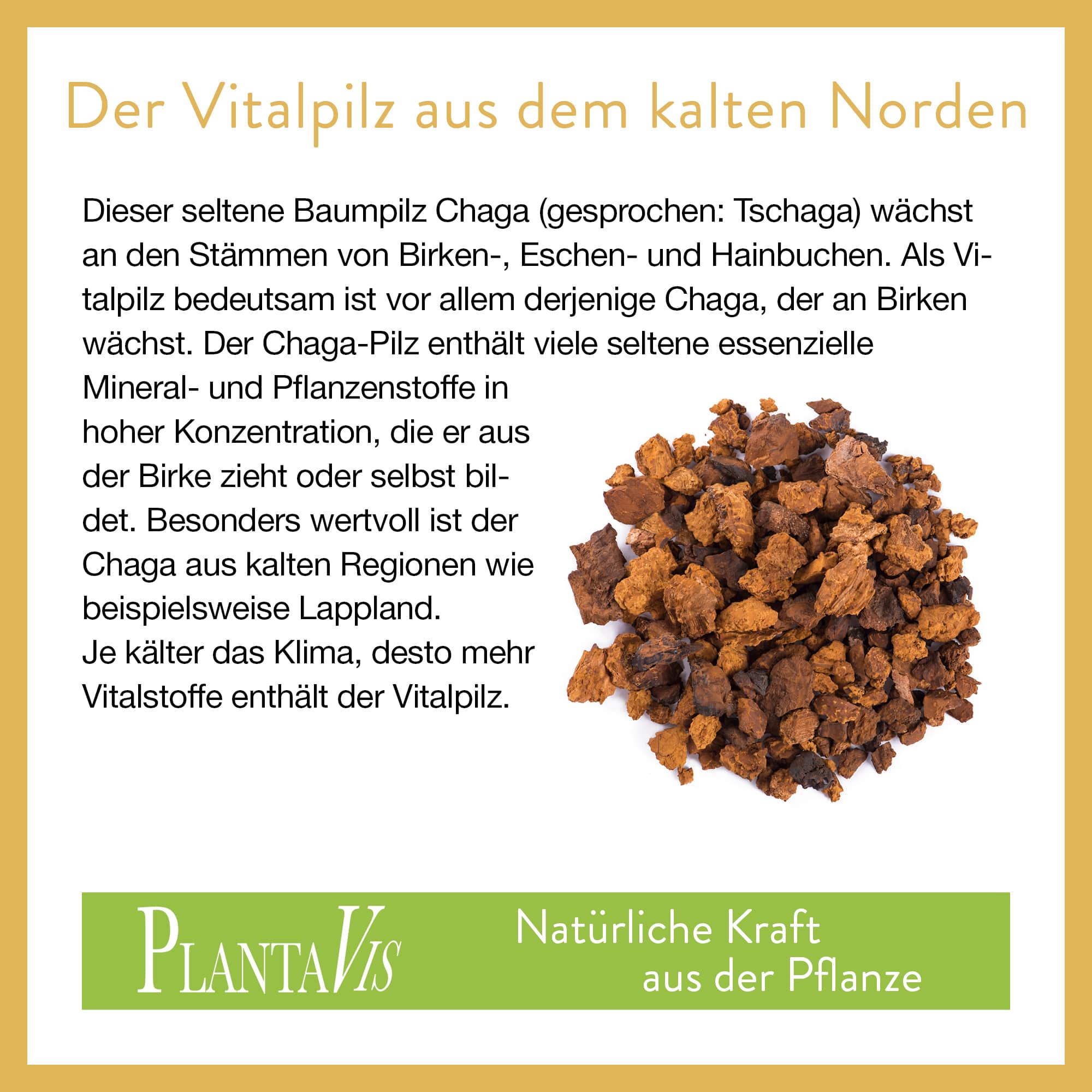 Dieser seltene Baumpilz Chaga (gesprochen: Tschaga) wächst an den Stämmen von Birken-, Eschen- und Hainbuchen. Als Vitalpilz bedeutsam ist vor allem derjenige Chaga, der an Birken wächst. Besonders wertvoll ist der Chaga aus kalten Regionen wie beispielsweise Lappland.