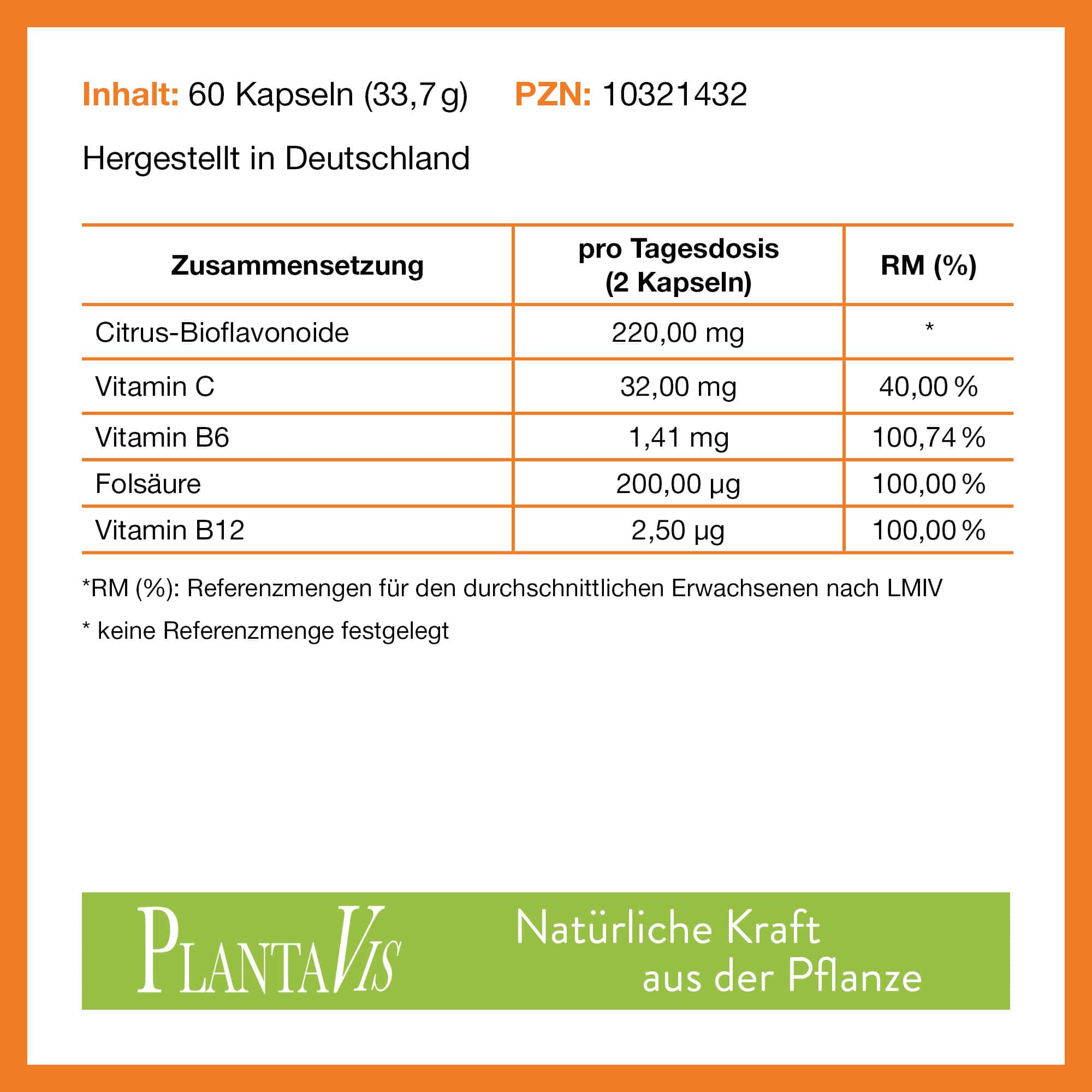 Citrus Extrakt (50% Bioflavonoide), Kapselhülle: Hydroxypropylmethylcellulose, Zellschutz Komplex (Camu Camu Extrakt mit 20% L-Ascorbinsäure1, L-Ascorbinsäure1, Jiaogulanextrakt, Cordycepspulver, Shiitakepulver, Kapernextrakt, Astragaloside Extrakt (1%), Gerstenextrakt mit 20-25% ß-Glucan, Chlorophyllin, Melonenextrakt (Extramel®), schwarzer Pfefferextrakt mit 95% Piperin), Ginkgo Bilobapulver, Buchweizen Samen Pulver, Rosskastanien-Extrakt (20% Aescin), Trennmittel: Magnesiumsalze der Speisefettsäuren, Mittelkettige Triglyceride, Cyanocobalamin 0,1% auf Mannit Pyridoxinhydrochlorid, Pteroylmonoglutaminsäure (Folsäure)