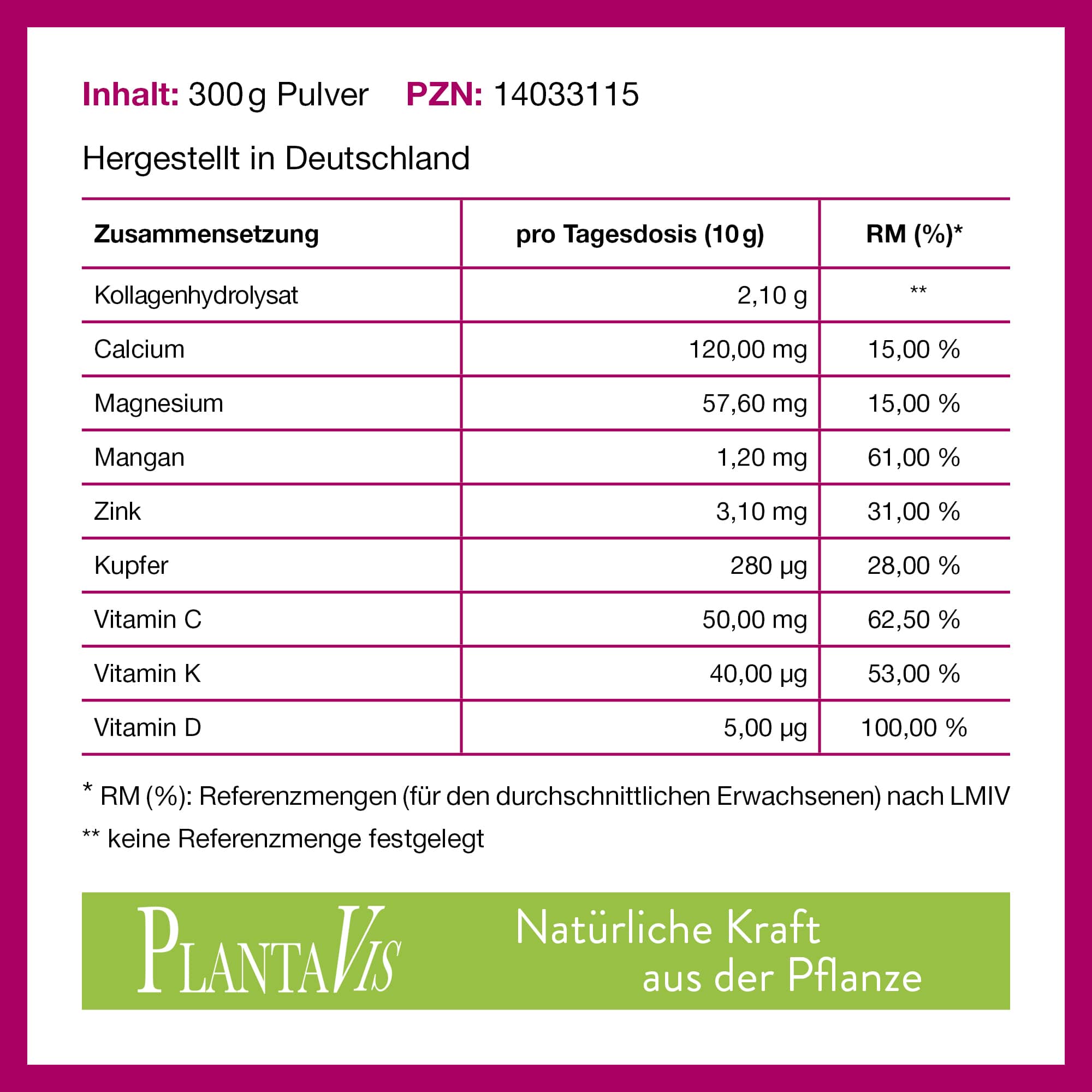 - *3 Magnesium, Mangan, Vitamin D, Vitamin K und Zink tragen zur Erhaltung normaler Knochen bei.