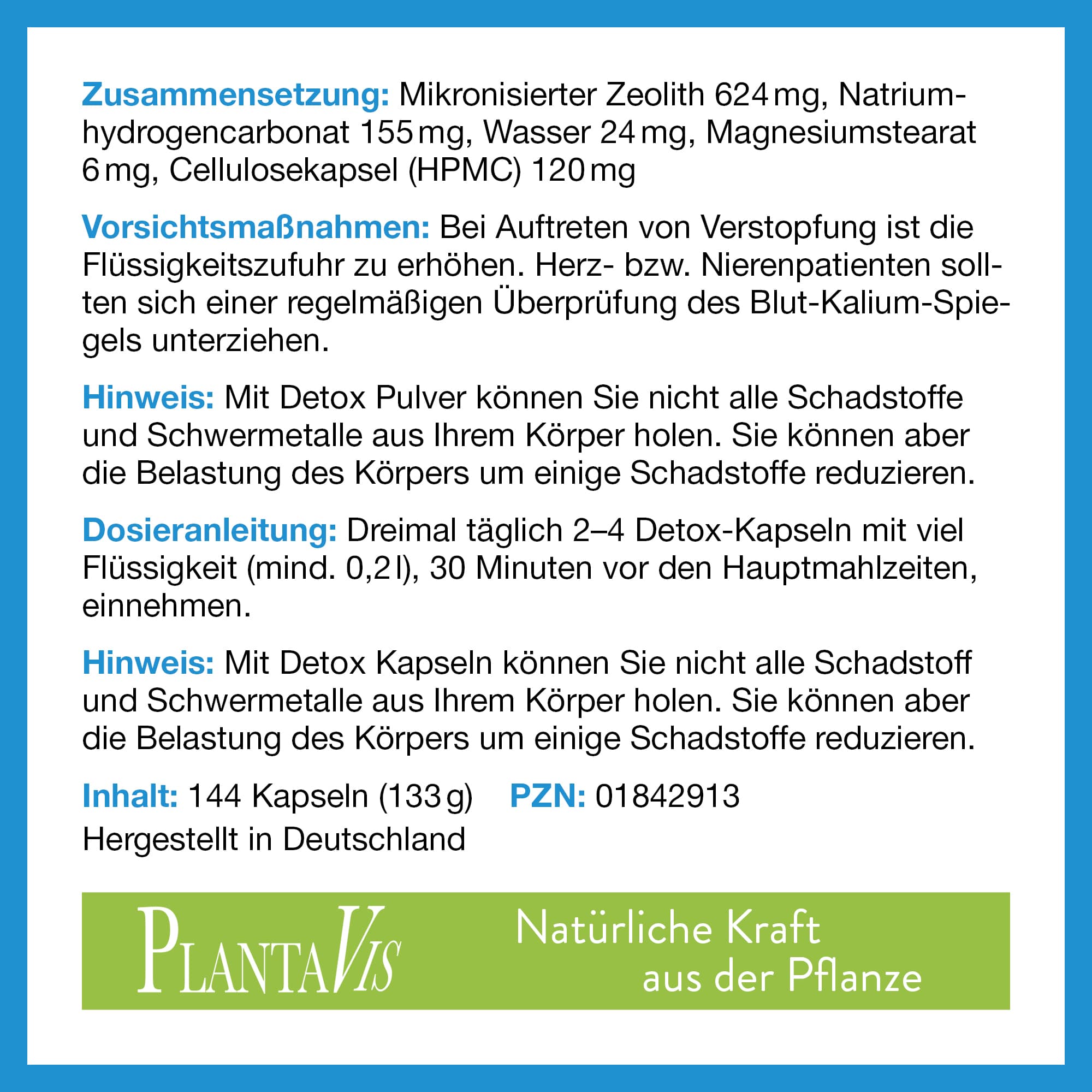 3x täglich 2–4 Detox-Kapseln mit viel Flüssigkeit (mind. 0,2l), 30 Minuten vor den Hauptmahlzeiten, einnehmen.