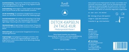 Detox-Kapseln „24-Tage-Kur“ bewirkt eine erhebliche Reduzierung der Ammonium- und Schwermetallbelastung des Körpers, insbesondere bei Blei, Cadmium und Quecksilber. Dadurch wird der Stoffwechsel von Leber, Niere, Bauchspeicheldrüse und Blut entlastet.