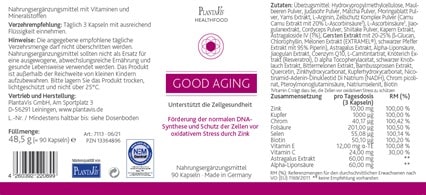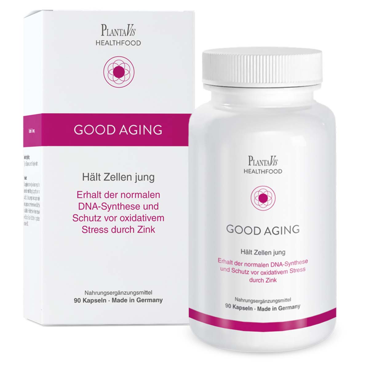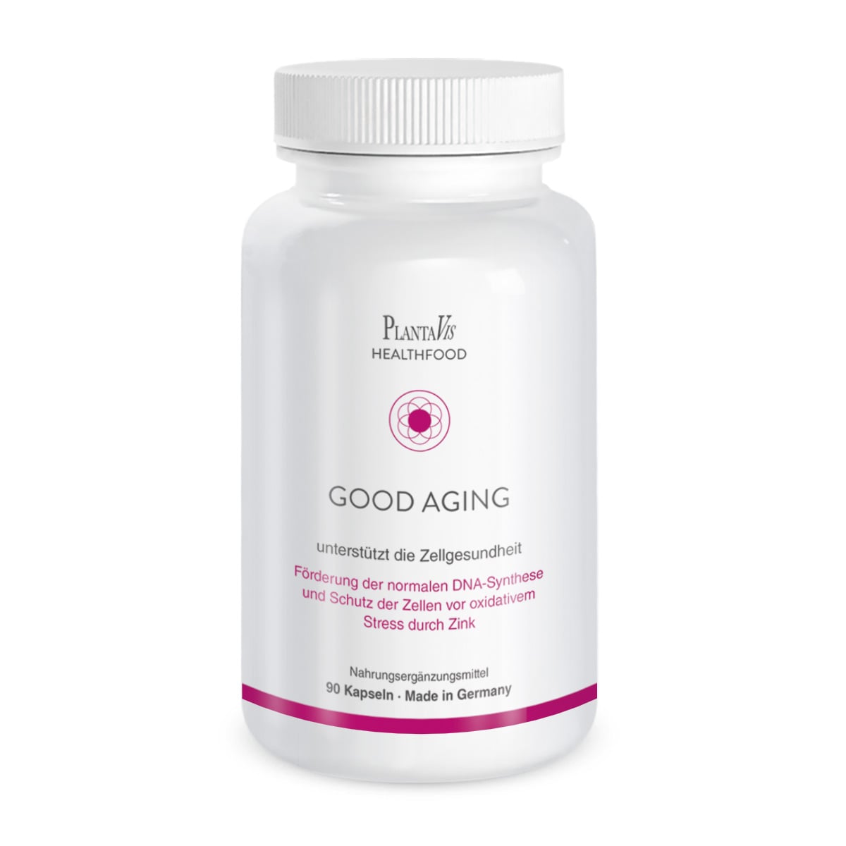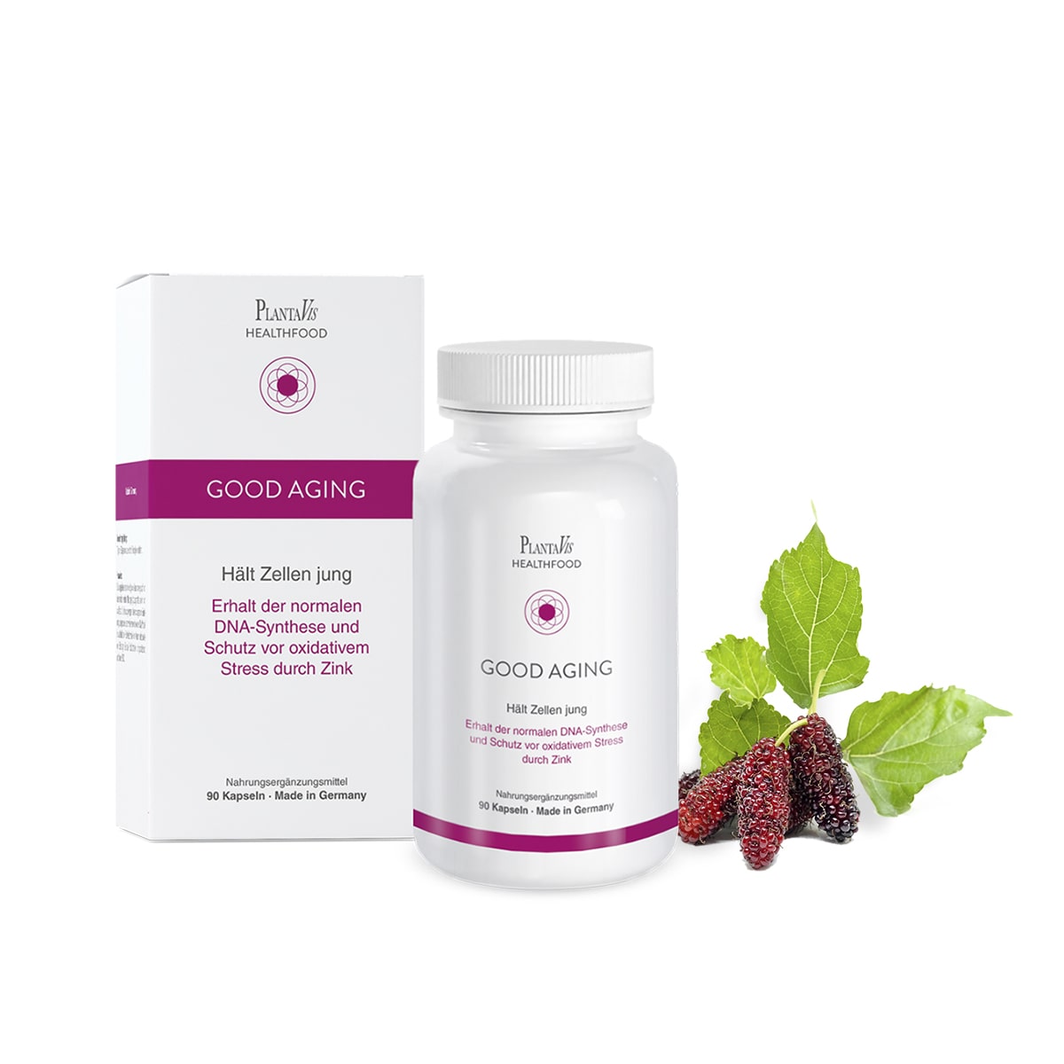 Neben wichtigen Vitaminen und Mineralstoffen, die bekannt sind für ihre antioxidative Wirkung, enthält Good Aging den einzigartigen PlantaVis-Zellschutzkomplex, der die enthaltenen Nährstoffe nochmals ergänzt.