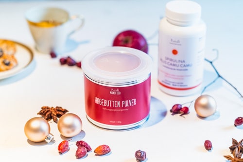 Im Hagebuttenpulver steckt die Kraft der berühmtesten Rosenart in geballter Form. Die roten Beeren sind ein besonders bekömmlicher und hoch konzentrierter Lieferant von zahlreichen Vitalstoffen. Das Pulver wird aus den getrockneten Scheinfrüchten hergestellt, wobei sowohl die Schale als auch die Nüsschen im Inneren verwendet werden – einzig die reizenden Härchen werden vor der Verarbeitung abgetrennt. Hagebutten gehören zu den vitaminreichsten Früchten und enthalten außerdem Polyphenole, Carotinoide und Gerbstoffe.