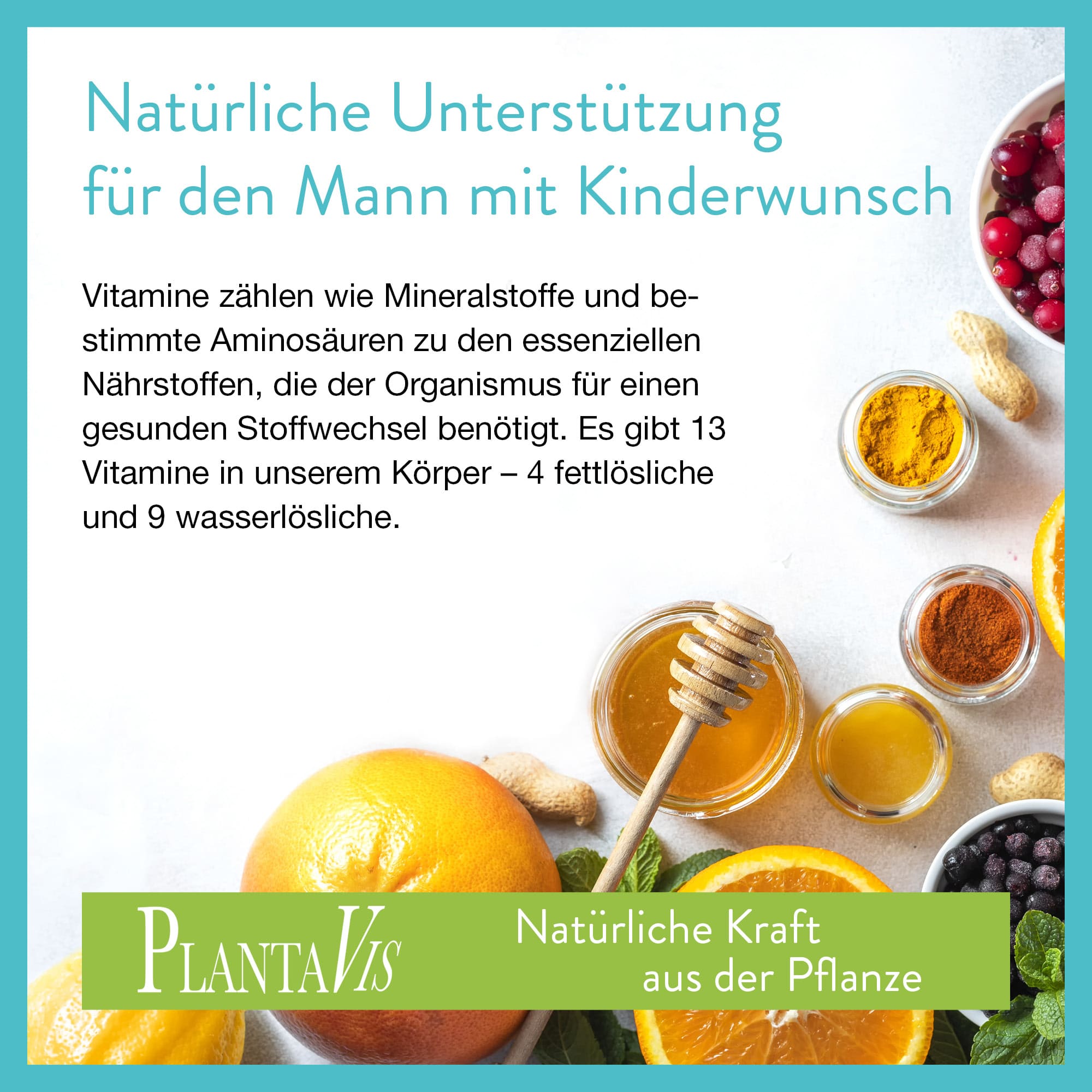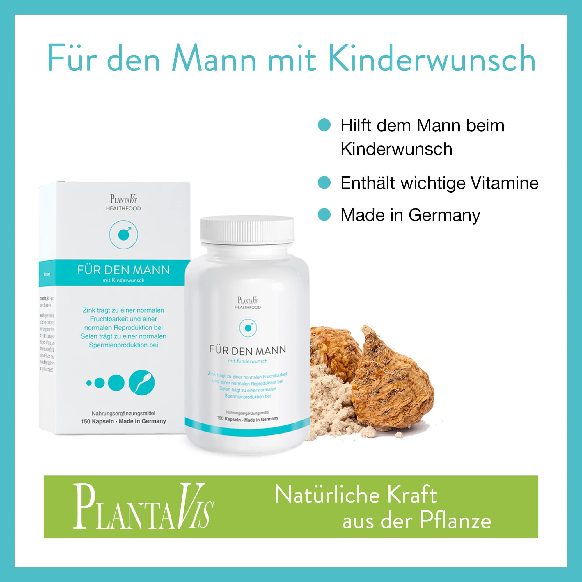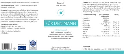 Die PlantaVis-Kinderwunsch-Kapseln für den Mann können Männern dabei helfen, ihre Fruchtbarkeit auf natürlichem Wege zu stärken. Die harmonische und ausgewogene Kombination von Vitaminen, Mineralstoffen und Spurenelementen kann die körperliche Vitalität optimal unterstützen und etwaige Defizite in der Vitaminversorgung ausgleichen.